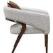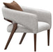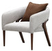 AICO Furniture Houston Accent Chair Pebble in Walnut 9095834-PBL-416. The Houston Accent Chair brings modern sophistication with a nod to mid-century elegance. Upholstered in a luxurious mingled boucle, its subtle blend of gray, ivory, and tan creates a refined and inviting look. The sculptural wood frame, finished in warm walnut, adds depth and contrast, while the curved barrel-back silhouette provides a stylish embrace. A reversible feather-filled accent pillow offers versatility in styling. Whether placed as a statement piece in any room or paired with the Houston collection, this chair elevates your space with understated glamour.