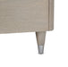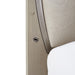 - Headboard features a half-moon panel upholstered in an ivory jacquard fabric