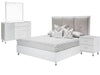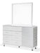 Aico Horizons Wall Mirror in Cloud White 9012260-108. The sleek design and innovative features of Horizons exemplify a European contemporary aesthetic. Clean lines and the alluring weaving of the "Cloud White" finish with bands of brushed metal creates a modern ambiance.