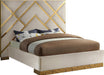 Take your bedroom space to a whole new modern level with this Vector cream velvet queen bed. Posh velvet upholstery in a lovely cream color is intersected by polished gold metal in a geometric design that is nothing short of spectacular. This stunning bed has a gold metal base to finish off the presentation on a glamorous and upscale note. Full slats are included with the bed to help provide support for your mattress, and the platform footprint ensures you need no box springs or foundation to recreate this look at home.