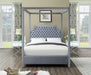 Ensure that every night's sleep is a dreamy escape with this Rowan Grey Velvet Bed as the centerpiece of your bedroom sanctuary. This bed features a velvet-clad canopy that beckons you to rest like royalty. The deeply detailed tufting on the scalloped headboard makes for a sumptuous presentation, and the chrome nail heads add to the luxe look of this exquisite bed.
