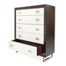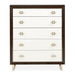 AICO Furniture Penthouse 5 Drawer Chest in Espresso 9085070SA-409. An epitome of grace and functionality, the Belmont Place Chest rises tall, boasting drawers that unfold stories of luxury. Each drawer, adorned with white anigre veneer and gleaming Japan gold plated alloy pulls, offers a haven of organization. Crowned with a white anigre veneer inlay and resting upon sleek legs, this chest is a celebration of design and craftsmanship.