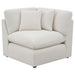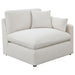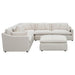 This modular sectional sofa blends modern style with luxurious comfort. Upholstered in soft performance fabric, it features feather blend-wrapped box cushions with reversible seating and backs for lasting support. Tailored topstitching and slim track arms create a sleek contemporary look, while plush accent pillows enhance comfort. Treated fabric resists moisture, allowing for easier maintenance and everyday durability. Designed for lounging, this sectional offers both elegance and versatility. Key Features: • Six-piece sectional in ivory fabric with slim track arms and tailored topstitching • Reversible seat and back cushions with feather blend filling provide soft comfort • Moisture-repellent treated fabric simplifies cleaning and everyday maintenance • Ottoman with plush cushion functions as footrest, coffee table, or extra seating • Accent pillows included to enhance comfort and complete the sectional design • Durable frame construction ensures strength and long-lasting living room use