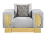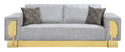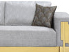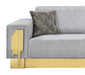 Make your living room luxurious with our exotic boutique collection. The oversized blocked arms and spring coil sofa is accented with gold finish metal on a high-end light gray chenille fabric. The silk and velvet toss pillows allow for the extra comfort for your back makes the living room your style statement. Throw pillows are included