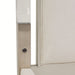 - Panel headboard and side panels are upholstered in a woven textured fabric with shimmer