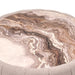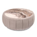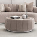 AICO Furniture Lucca Cocktail Table in Silver LFR-LUCA201-808. The Lucca Cocktail Table exudes understated luxury. Its round silhouette is elegantly dressed in a soft, channeled woven fabric, creating a warm juxtaposition with the sleek faux marble top. Nestled on a narrow silver base, it's a striking conversation starter, serving sophistication with every pour.