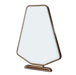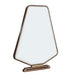 AICO Furniture Houston Vanity Mirror in Walnut 9095068-416. A striking blend of modern geometry and timeless elegance, the Houston Vanity Mirror is designed to elevate any space. Its bold, angular silhouette is framed in rich walnut, accented with a sleek gold trim that enhances its refined aesthetic. The sturdy base features coordinating gold accents, adding a touch of understated glamour. A beveled edge completes the look, creating depth and dimension for a polished finish.