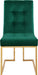 Elevate your dining experience with this Pierre green velvet dining chair. A boxy geometric shape makes this chair an uber modern addition to your space, while a base of stainless steel makes it durable and tough, so it holds up to heavy daily use. The gold tone finish on the base contrasts nicely with the green velvet upholstery used on the seat and back. Heavy tufting adds to the rich appeal of this beautiful design.