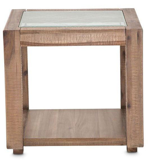 Hudson Ferry Collection by AICO Furniture Driftwood finish Constructed with Acacia wood solids and veneer Glass diamond pattern top Open bottom sh...
