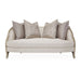 AICO Malibu Crest Loveseat in Chardonnay N9007825-CLDWH-822. Alluring aesthetics and comfy contours come together in the Malibu Crest Loveseat, which is a classy piece with modern classic aesthetics. Featuring silk-like upholstery, the loveseat has V-notch arms finished in Chardonnay that adds the perfect trim around the piece. To heighten the love seat comfort factor, four display pillows are included.