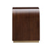 AICO Furniture Houston End Table in Walnut 9095202-416. The Houston End Table is a striking blend of modern artistry and functional design. Its curved silhouette showcases a seamless walnut veneer top, while the open interior gleams with a lustrous gold finish. The bold contrast and sculptural form make it an elegant accent piece that enhances any living space with a touch of refined luxury.