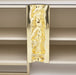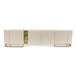 AICO Furniture Lisbon Media Cabinet in Silken Cream Bronze LFR-LSBN081-144. A strong design statement, this vibrantly modern piece becomes a focal point in any room with multiple storage opportunities. The ribbed lines with the slender brass-finished base hardware provide the perfect façade, while the detailed enclave with brass detail ads interest and makes this piece completely unique.