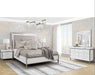 AICO Marquee Eastern King Panel Bed in Cloud White KI-MRQEQN-108. An interior style that lasts. The Marquee Bed is made with the finest materials and a flawless design. Glossy lacquer finishes, brushed stainless steel frames, and a diamond tufted headboard create this beautiful centerpiece that's ready to redefine your bedroom. Plug in your phone at night using the USB headboard plugs, and enjoy your haven!