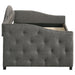 Sweeping lines and timeless details come together in this transitional twin daybed and trundle set. Wrapped in a soft fabric that coordinates with all sorts of color palettes, this daybed and trundle combo lends traditional elements such as a button-tufted back and sides. Thin sloped sides and a camelback offer a graceful design and feminine charm to compact rooms where additional sleeping arrangements come in handy. Tucked beneath the main frame is a hidden trundle set, easily retrievable and concealed by a smooth padded panel. Black legs elevate the trundle bed ever so slightly, allowing finished floors and colorful rugs to shine through. Key Features: • A transitional camel back with button tufted detailing, creates a cozy focal point for any guest room or smaller sized area • Functional convenient pull out trundle for an extra sleep space when needed • Upholstered in a versatile grey fabric • Constructed with poplar and MDF • Slat kits included